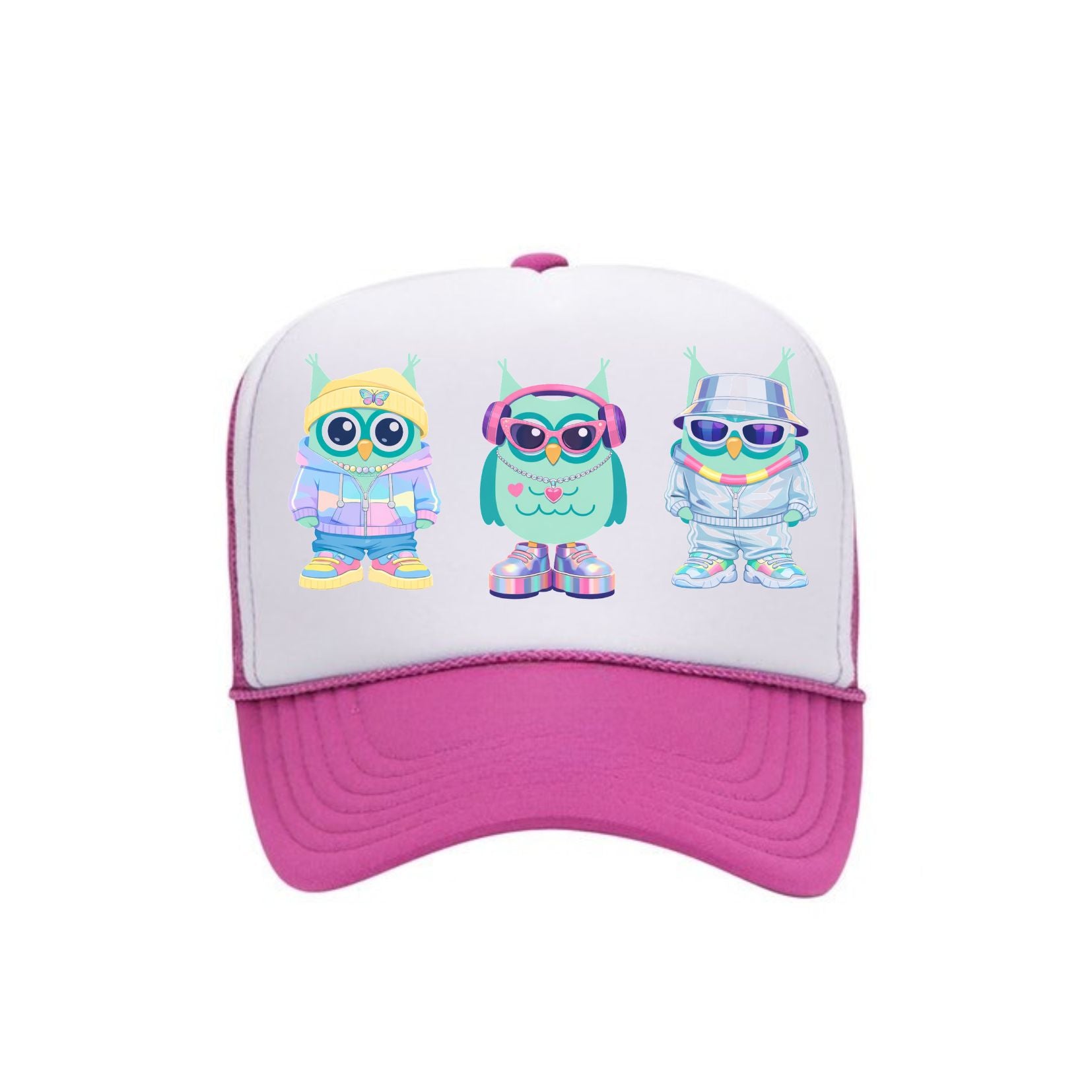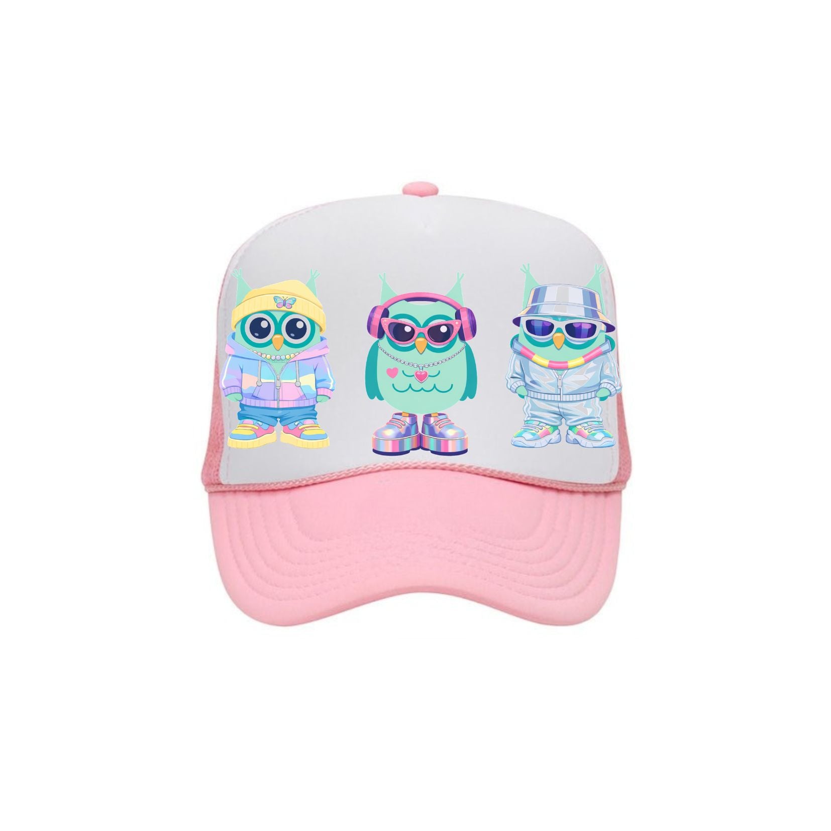 This custom Virginia Highland Elementary trucker hat features three fun Hootie owl graphics on the front in a playful Y2K style. Perfect for showing school spirit at the auction and school events.